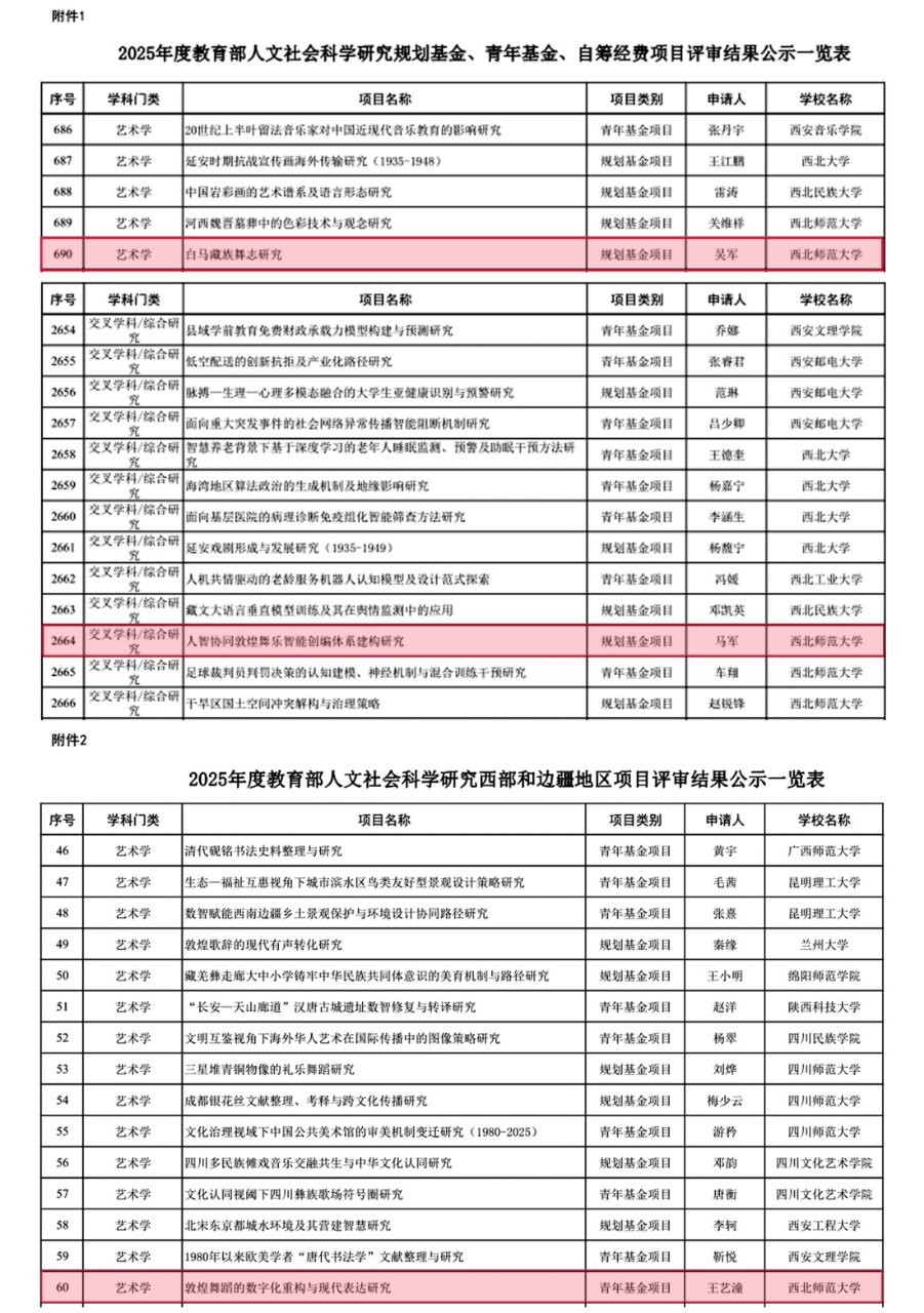 近日,依据《教育部社科司关于 2025 年度教育部人文社会科学研究一般项目申报工作的通知》及《教育部人文社会科学研究项目管理办法》相关规定,教育部社会科学司正式公布 2025 年度教育部人文社会科学研究一般项目立项名单,公司共有3项课题成功获批,其中规划基金项目2项、青年基金项目1项。学院吴军教师的《白马藏族舞志研究》、马军教师的《人智协同敦煌舞乐智能创编体系建构研究》获得规划基金项目立项,王艺潼教师的《敦煌舞蹈的数字化重构与现代表达研究》获得西部青年基金项目立项。