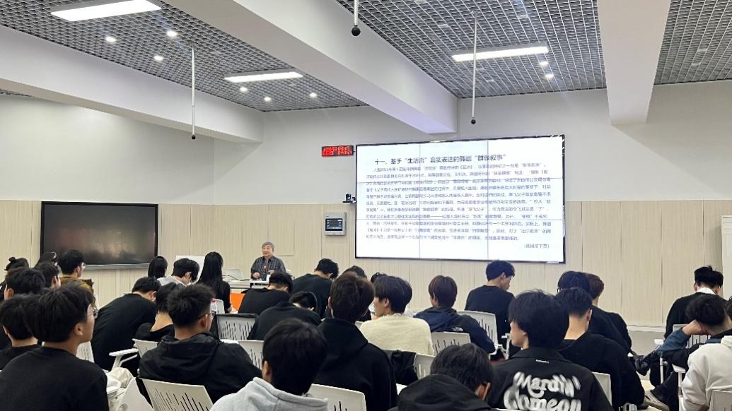 于平老师讲座中以舞剧《红楼梦》为始到《雷雨》再到《永不消逝的电波》等等舞剧的分析,详细的讲解了“群像叙事”这一核心概念。于平老师说到“群像叙事”叙述的不是“一个人”而是“一群人”的故事,也是揭示“历史真相”的有力手段。在讲座的最后提到舞剧“群像叙事”的悄然崛起或许只是一种值得注意的叙事方式,但它肯定维系着更宏阔的编译理念和更深邃的表达动机——相信它一定会走得正、走得好、走得远!